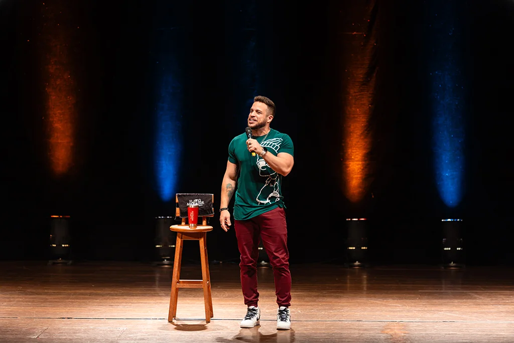 O recifense Flávio Andradde é humorista e ator, conhecido por sua versatilidade no palco e seu humor que mistura situações cotidianas com toques de criatividade e improviso. Com uma trajetória que vai do teatro à comédia stand-up, Flávio conquistou o público com seu carisma e habilidade de transformar histórias simples em momentos hilários e memoráveis. Seu trabalho é uma celebração da leveza e da autenticidade, refletindo sua paixão por conectar pessoas através do riso.
